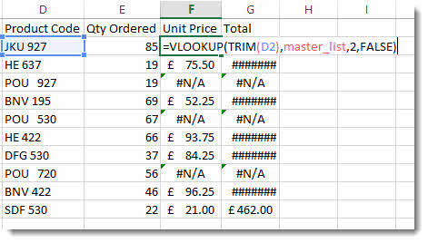 If I perform a VLOOKUP without the TRIM function, I get a number of error #N/A results, meaning that no match can be found. These product codes have been entered with too many spaces.