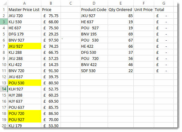 See the example below: I have a master list of product prices in the first table which I want to use in the second table. The VLOOKUP will cross reference the product codes in table 2 with the product codes in table 1 and carry across the correct price. Some of the product codes in table 2 have additional spaces between the text portion and number portion of the code as well as trailing spaces.