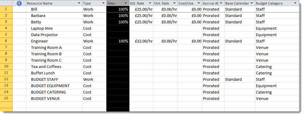 Create the budget resources as you would a normal resource. Microsoft recommends that you enter the resource names in BLOCK CAPS or prefix the names with “Budget” to distinguish them from the other types of resource. Remember to assign the correct resource type for the budget – work, material or cost.