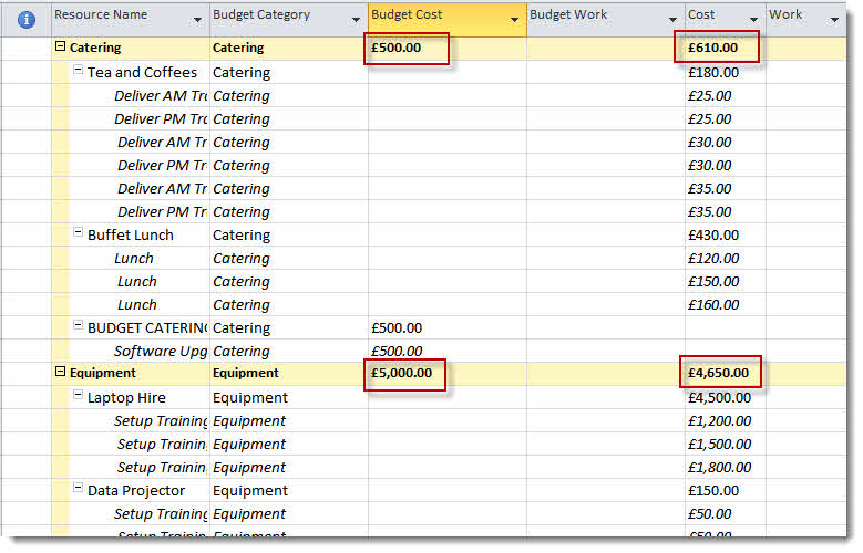You will now be able to compare your budget values with your cost values as shown below.