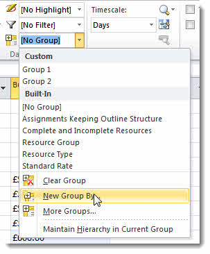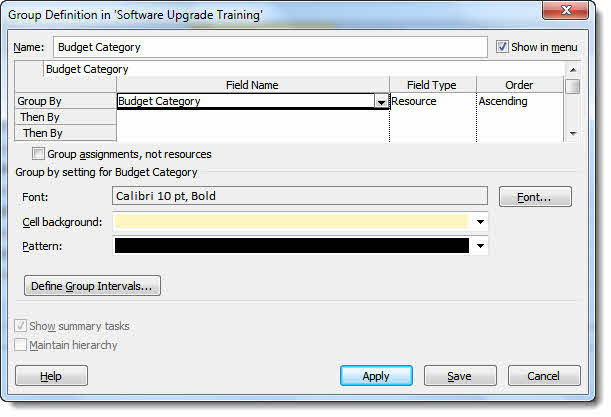 To view the budget values against the relevant costs you need to group resources by Budget Category (your custom field). To group in this way click on the Ribbon’s View tab and in the Data group open the Group by: menu. Select New Group By…