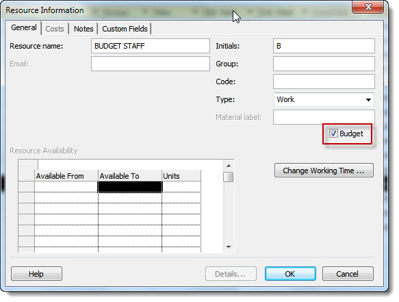 Once you have created a budget resource you need to tell project to treat it as such. To do this, double-click on the resource name and in the Resource Information dialog, check the Budget option as shown below.