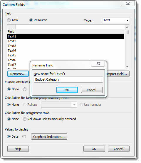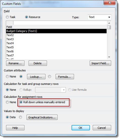 Back in the Custom Fields dialog under Calculation for assignment rows, select the radio button for Roll down unless manually entered – this will help later on the in resource sheet view.