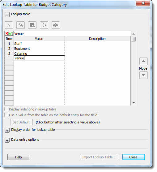 To create the drop down, click on the Lookup button and then enter the budget categories for your project – these should match the budget resource names.