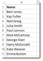 Let’s look at a practical example of where we can use a combination of text functions. To start with I’ve got a list of names. The names have been entered: first name, last name. Say I wanted to reverse the order of the names, so the pattern become last name, followed by a comma, then first name – for example Jones, Bert.