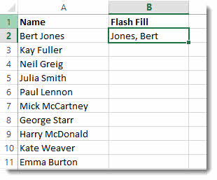 One option would be use the Text to Columns command and then to concatenate (join) back the names, but in reverse order. To use this method, start off by selecting all the cells containing names. Then on the Data Tab on the Ribbon and in the Data Tools group, click the Text to Columns button. Click Next in the first step of the wizard and in the second step ensure the correct delimiter is selected – in our case a space.