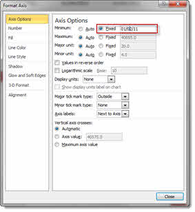 To change the start date on your horizontal axis, double-click the horizontal axis labels. Click the Fixed radio button for the minimum value option and then add your start date to the box as shown below. Click Close to confirm.