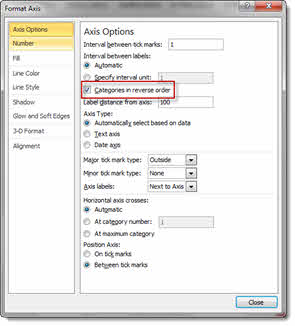 To change the order of the tasks so Task 1 appears at the top of the chart, double-click on the vertical axis labels. In the Format Axis dialogue box tick the Categories in reverse order option. Click on Close to confirm.