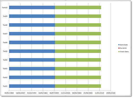 We are now going to hide the Start Date series. To do this click on any blue bar – this will select all blue bars on your chart. Now click on the Format tab on the Ribbon and use the Shape Fill menu to set the fill to No Fill and use the Shape Outline menu to set the outline to No Outline.