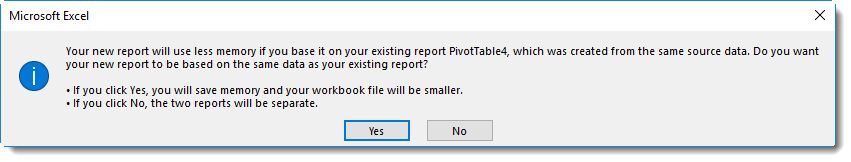 What happens next depends very much on whether your data source is in an Excel Table or not (an Excel table is created by using the Insert | Table command). If your data is not in an Excel table and the data source is already cached by an existing PivotTable, you will be given the option to either share or not share.