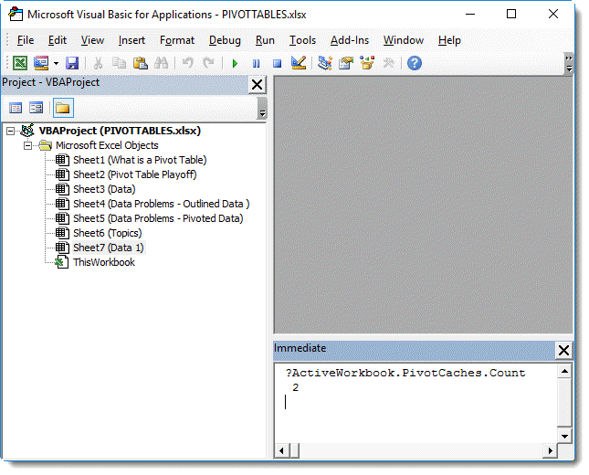 If you are unsure how many caches exist within a workbook you can get Excel to count them for you. You need a small bit of VBA which you input into the Immediate window of the Visual Basic editor.