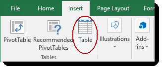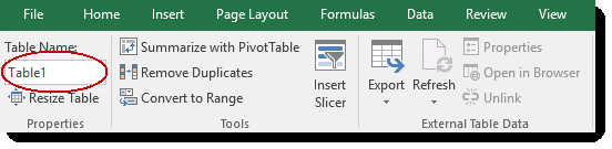 A Design tab appears on the Ribbon when you create an Excel table. On the far left of the Design tab a Table Name box displays the table name, by default this will be Table1. You don’t need to change table name at this stage but do understand that the table has been named.