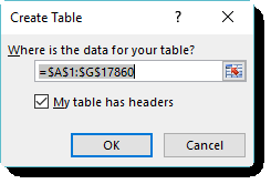 The Create Table dialog will confirm your data source. Click on OK to confirm.