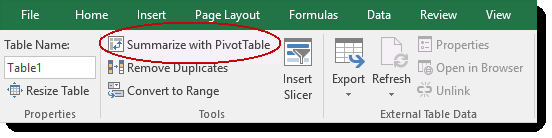 Now start the process of creating your PivotTable by clicking on the Summarize with PivotTable button on the Ribbon’s Design tab.