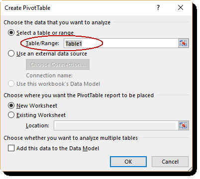 In the Create PivotTable dialog you will see that the PivotTable is using the Excel table as its data source. Choose where you want the PivotTable to be located and then click OK to confirm.