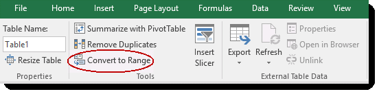 Now you need to convert your table back to a normal range. To do this click anywhere in your data source and click the Convert to Range button on the Ribbon’s Design tab.