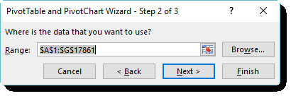 - Click Back to take you from Step 3 to 2 and change the range so it includes one fewer rows eg $A$1:$G$17860 becomes $A$1:$G$17859