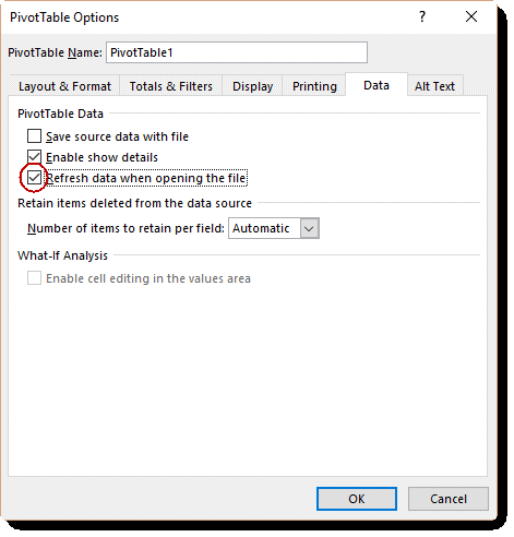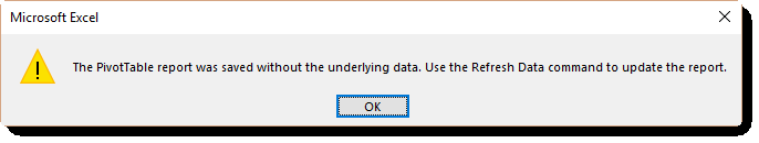 In the PivotTable Options dialog, click the Data tab and then uncheck the option Save data source with file. Click on OK to confirm.