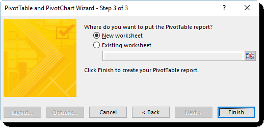 In the final step, select a location for your PivotTable and then click Finish to confirm.